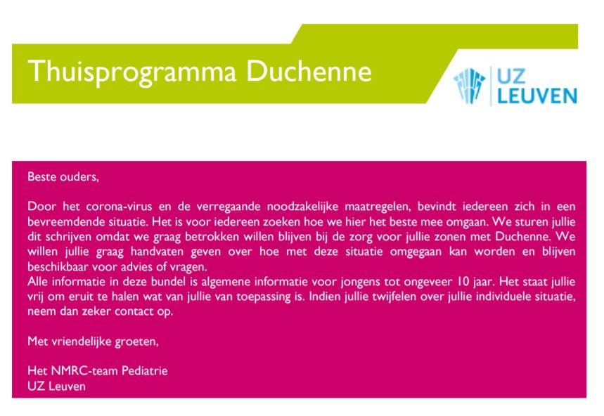 Onderaan vind je de pdf file die je volledig kan downloaden en afprinten.Volgende bundels voor oudere categorieën volgen in de volgende dagen.Hier vind je de pdf om te downloaden en af te drukken: Duchenne@home.pdfTélécharger PDF • 426KB